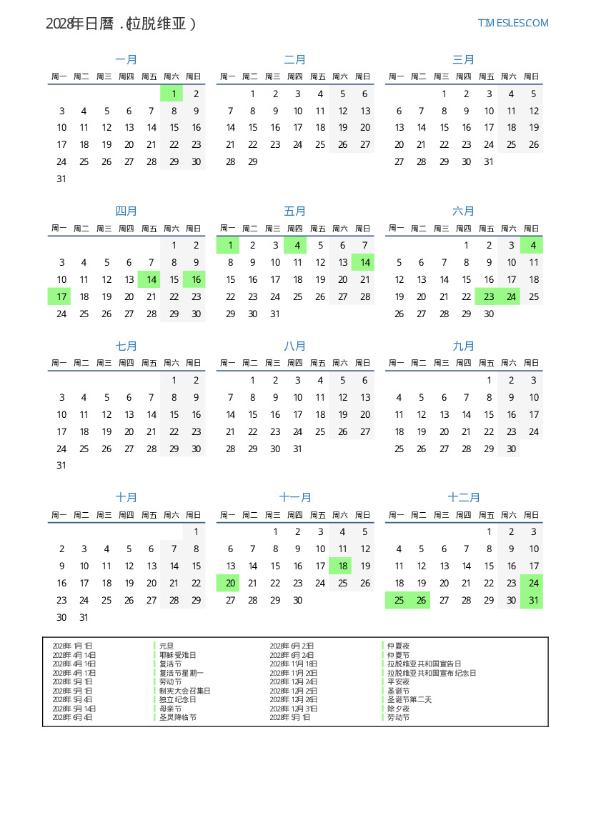 下載並打印2028年拉脱维亚節假日和周末的PDF日曆