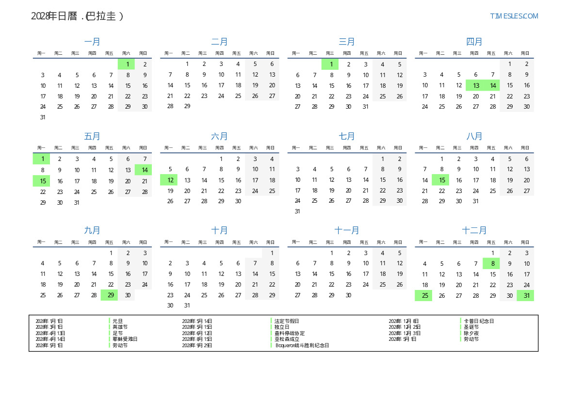 下載並打印2028年巴拉圭節假日和周末的PDF日曆