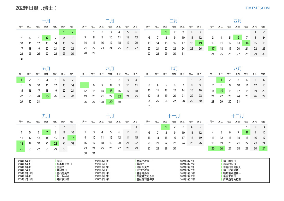 下載並打印2028年瑞士節假日和周末的PDF日曆