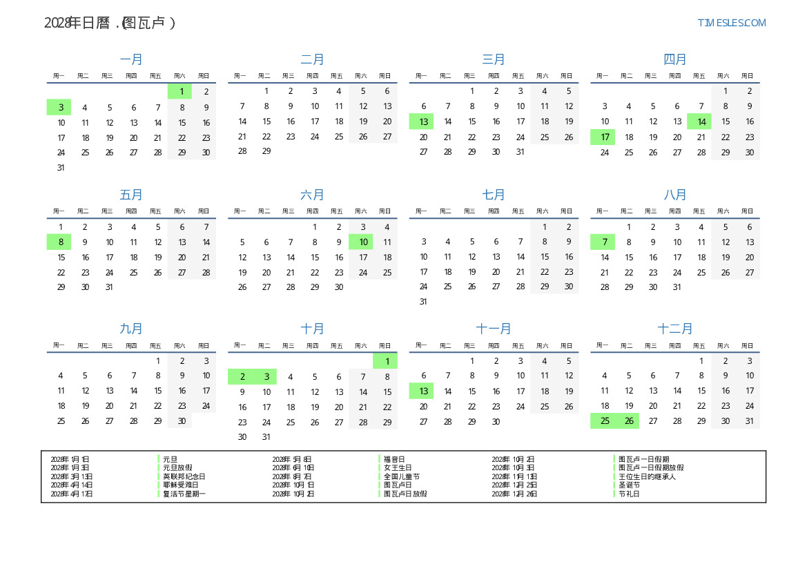 盧薩对于图瓦卢的2028年假期和周末日曆