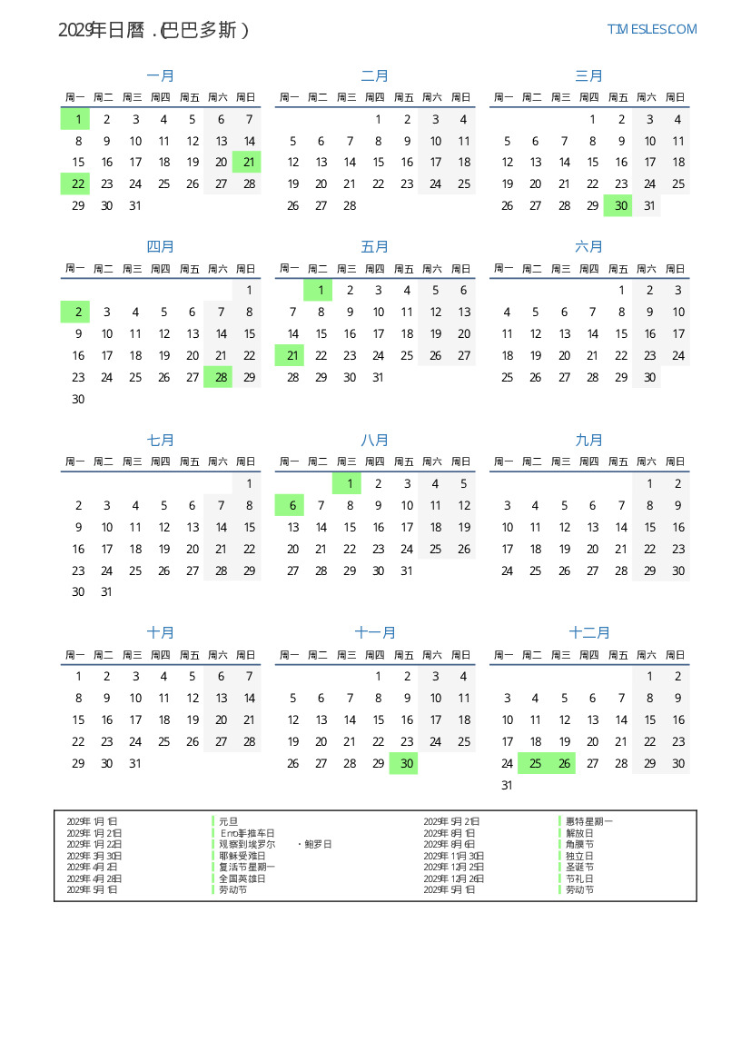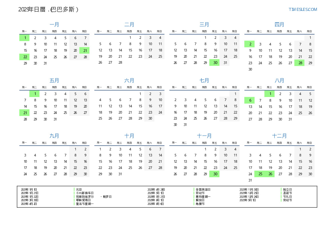 下載並打印2029年巴巴多斯節假日和周末的PDF日曆