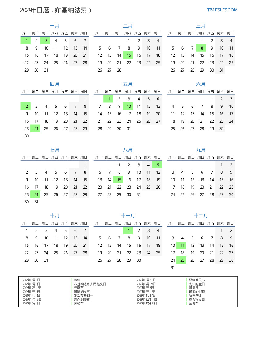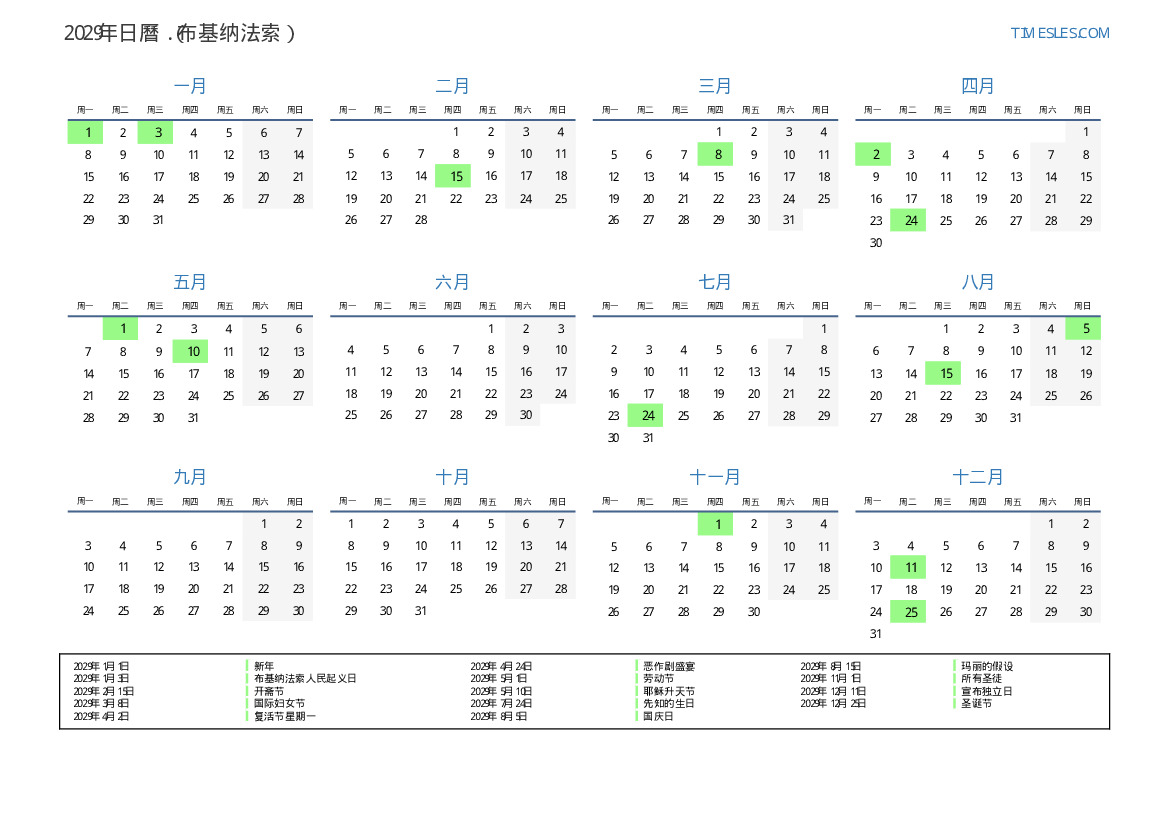 下載並打印2029年布基纳法索節假日和周末的PDF日曆