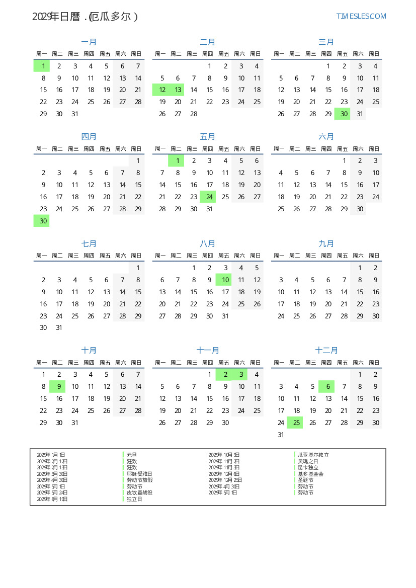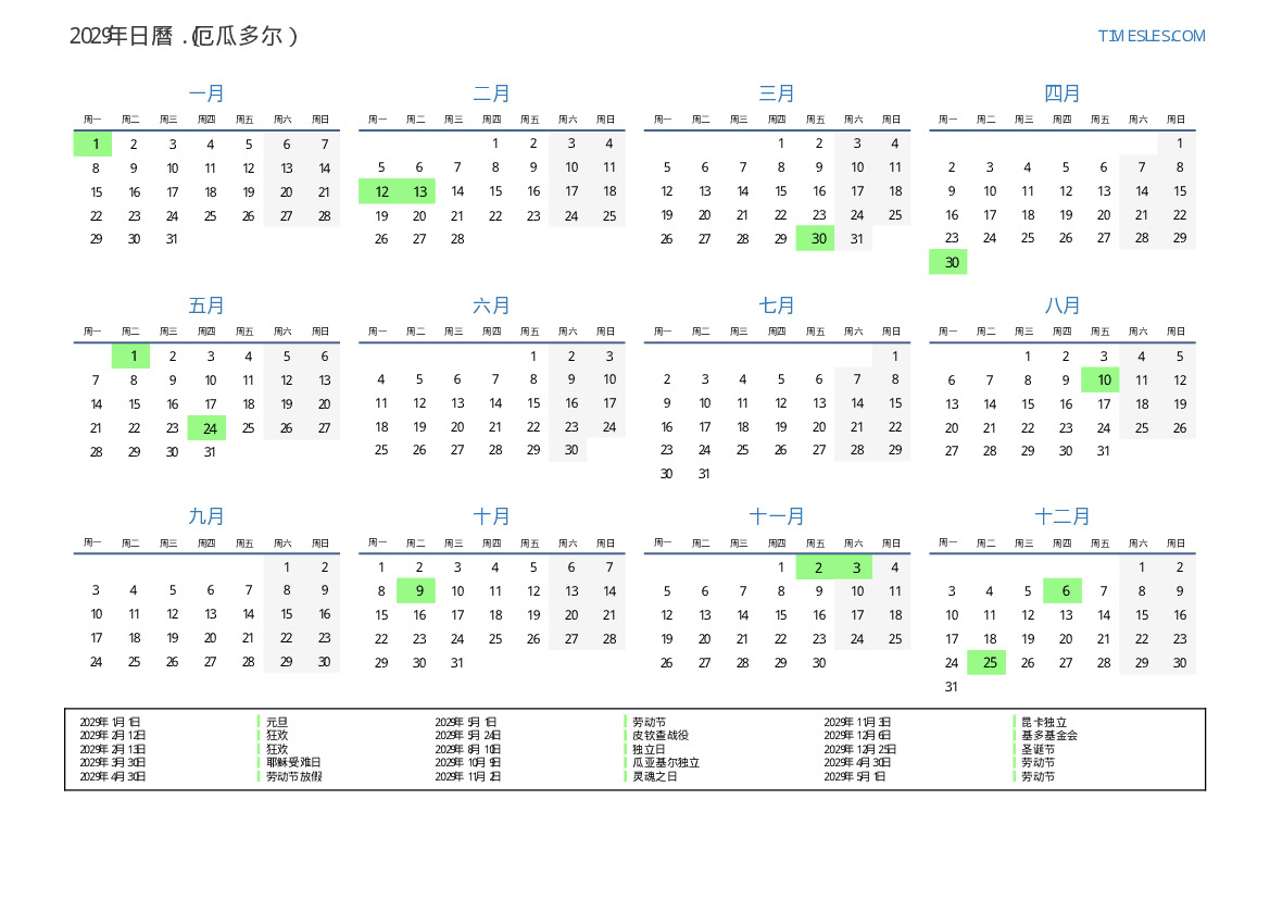 下載並打印2029年厄瓜多尔節假日和周末的PDF日曆