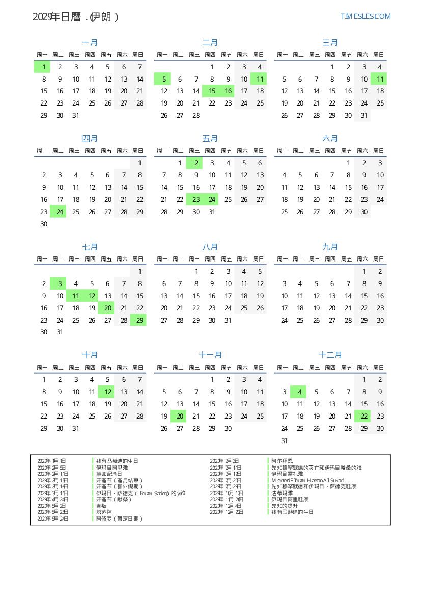 下載並打印2029年伊朗節假日和周末的PDF日曆