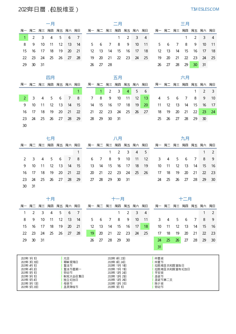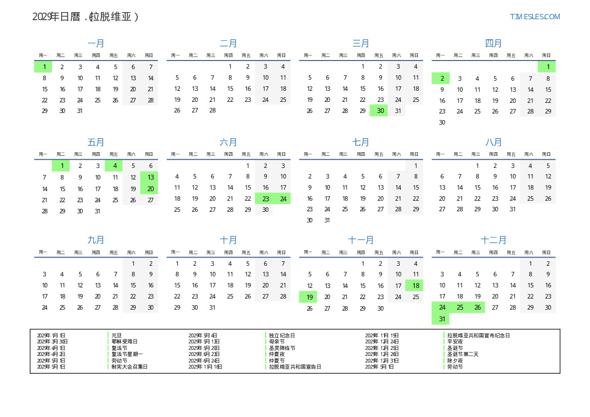 下載並打印2029年拉脱维亚節假日和周末的PDF日曆