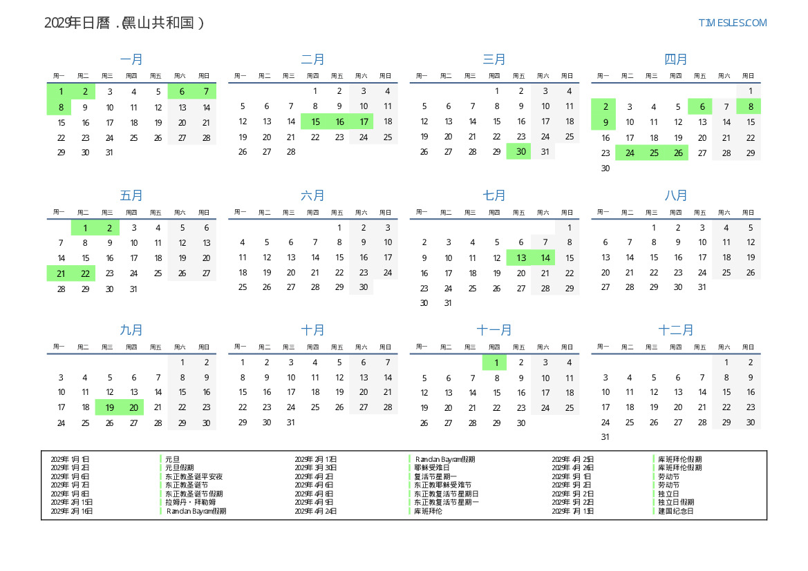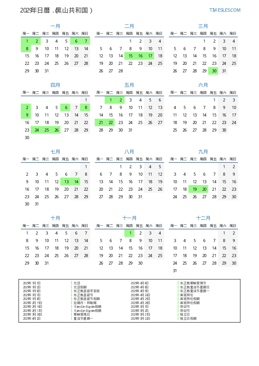下載並打印2029年黑山共和国節假日和周末的PDF日曆