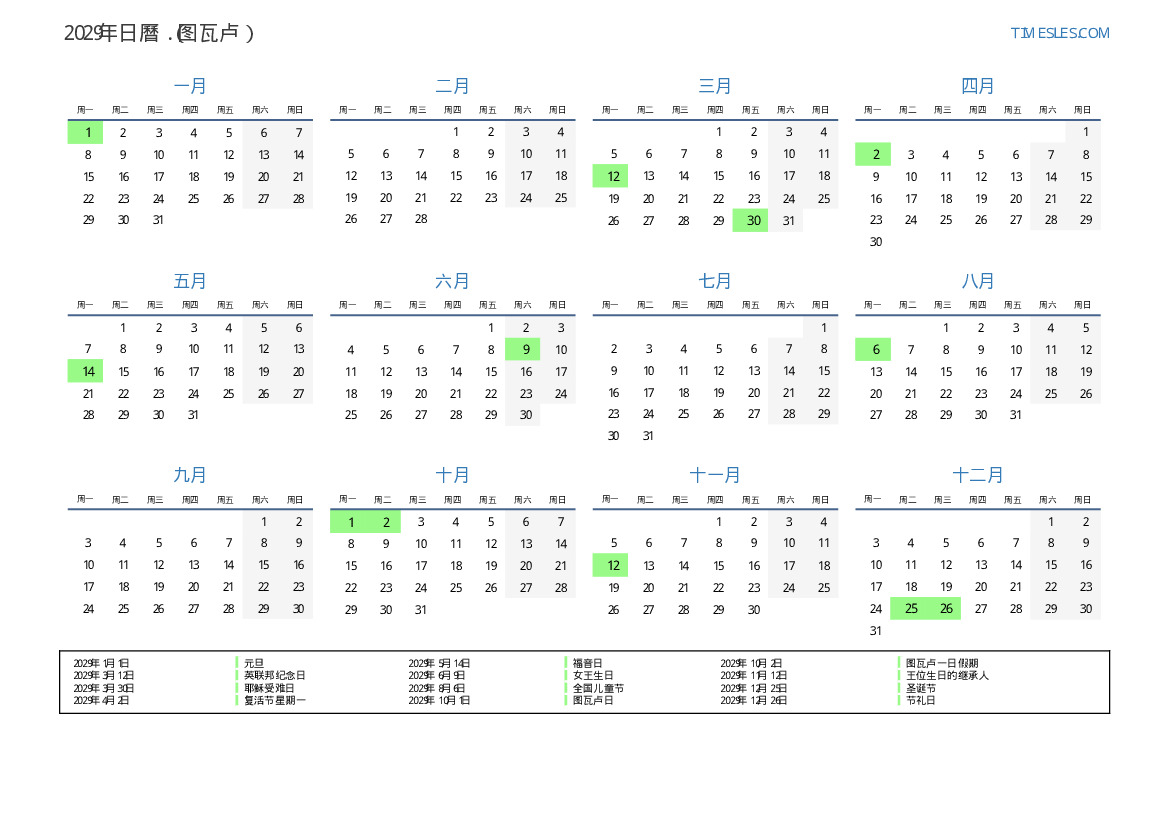 盧薩对于图瓦卢的2029年假期和周末日曆