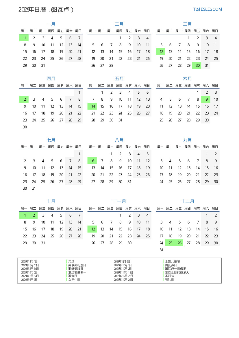 2029年对于图瓦卢日曆