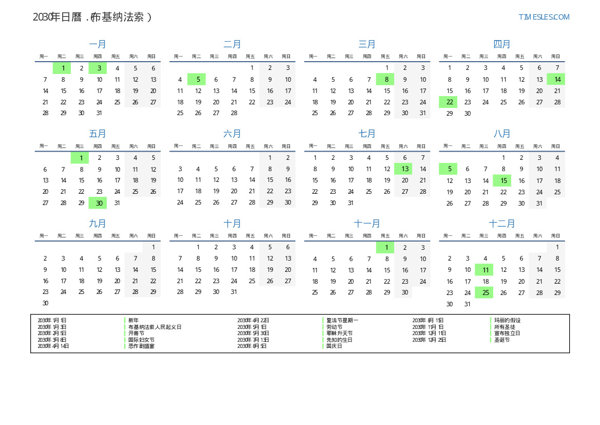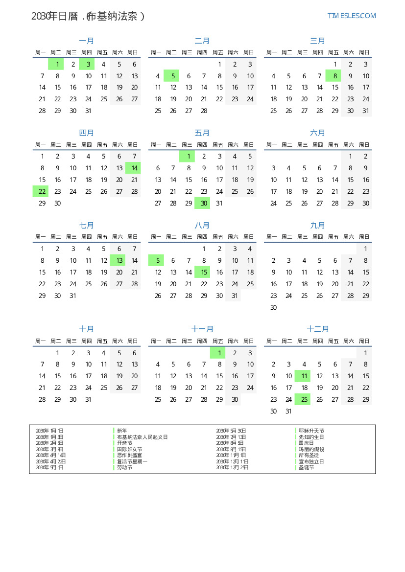 下載並打印2030年布基纳法索節假日和周末的PDF日曆