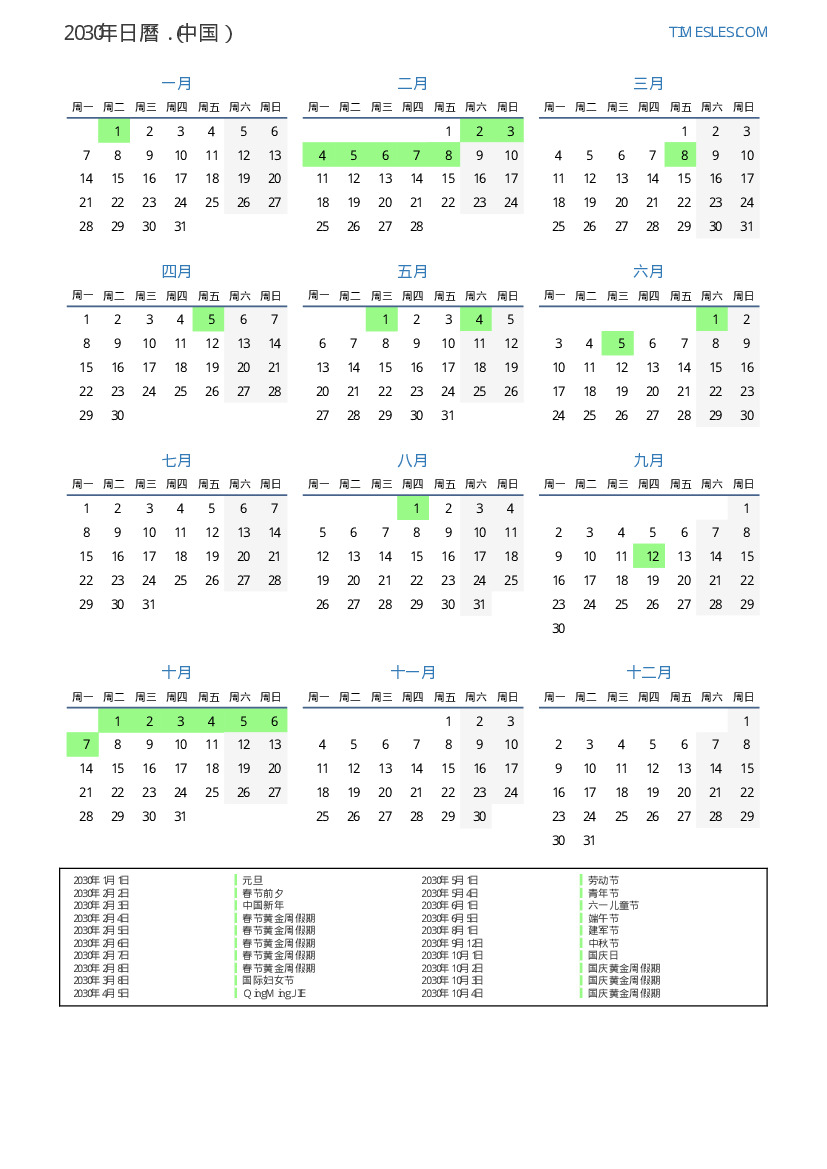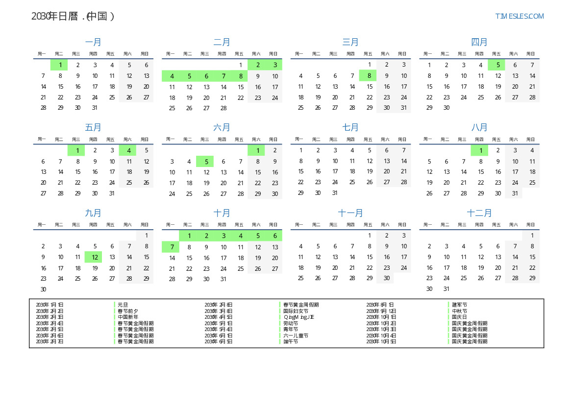 下載並打印2030年为中国節假日和周末的PDF日曆