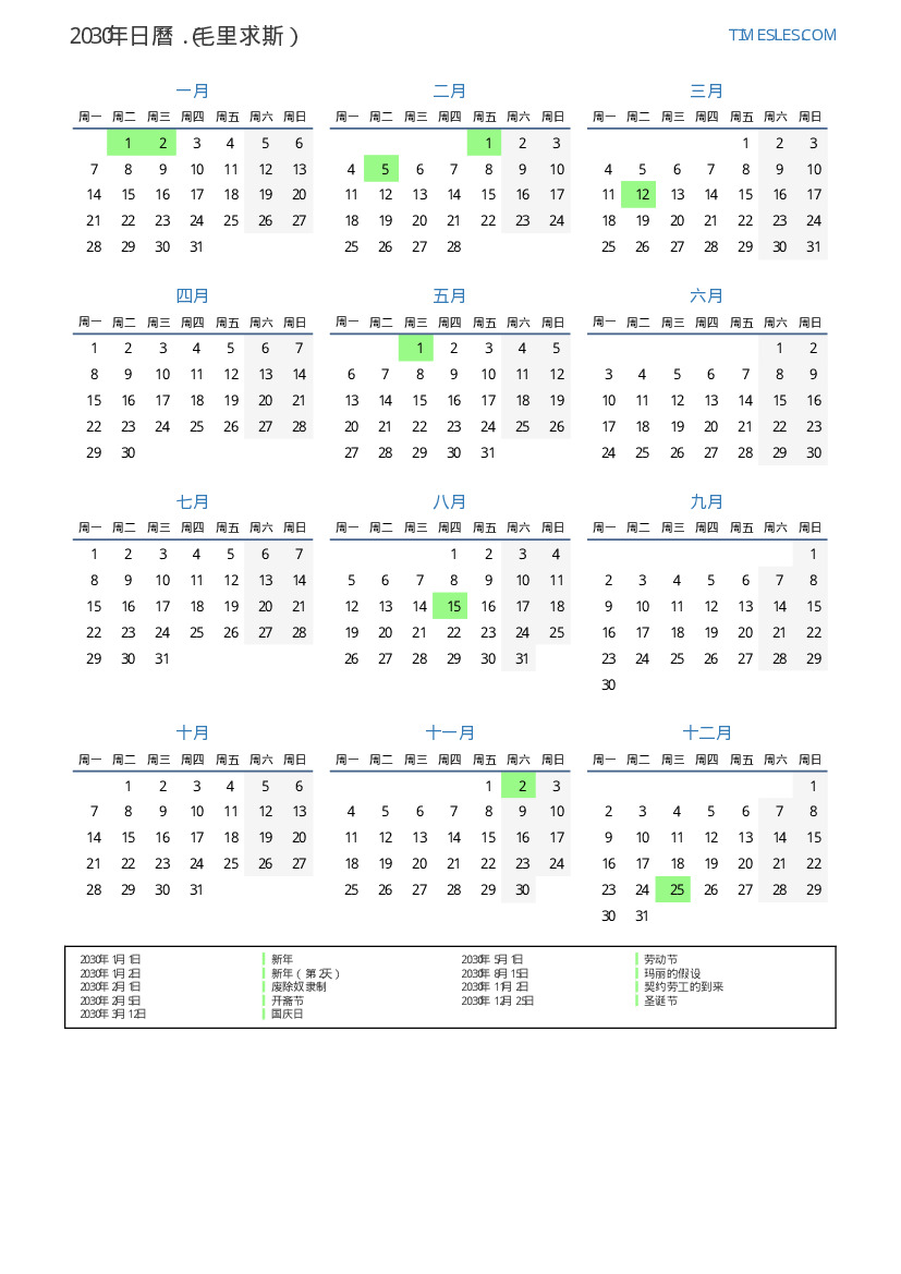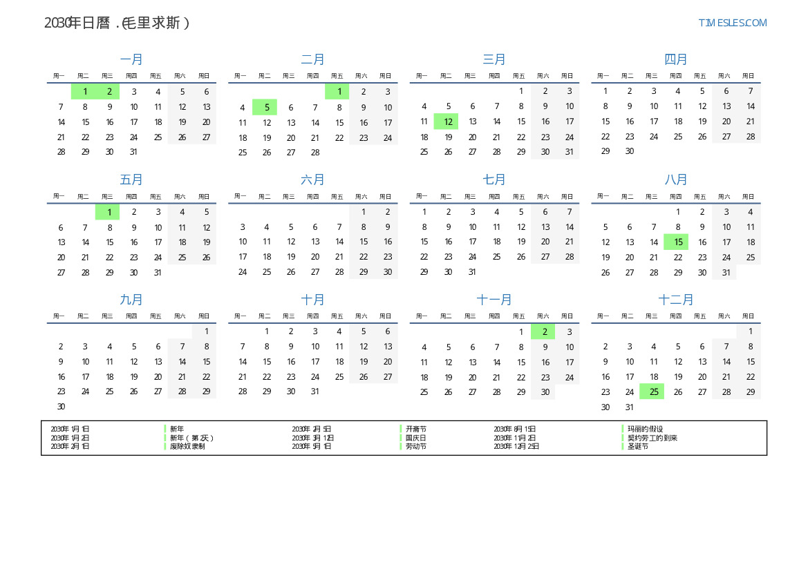 下載並打印2030年毛里求斯節假日和周末的PDF日曆