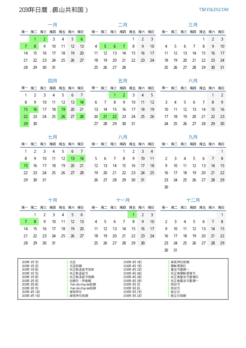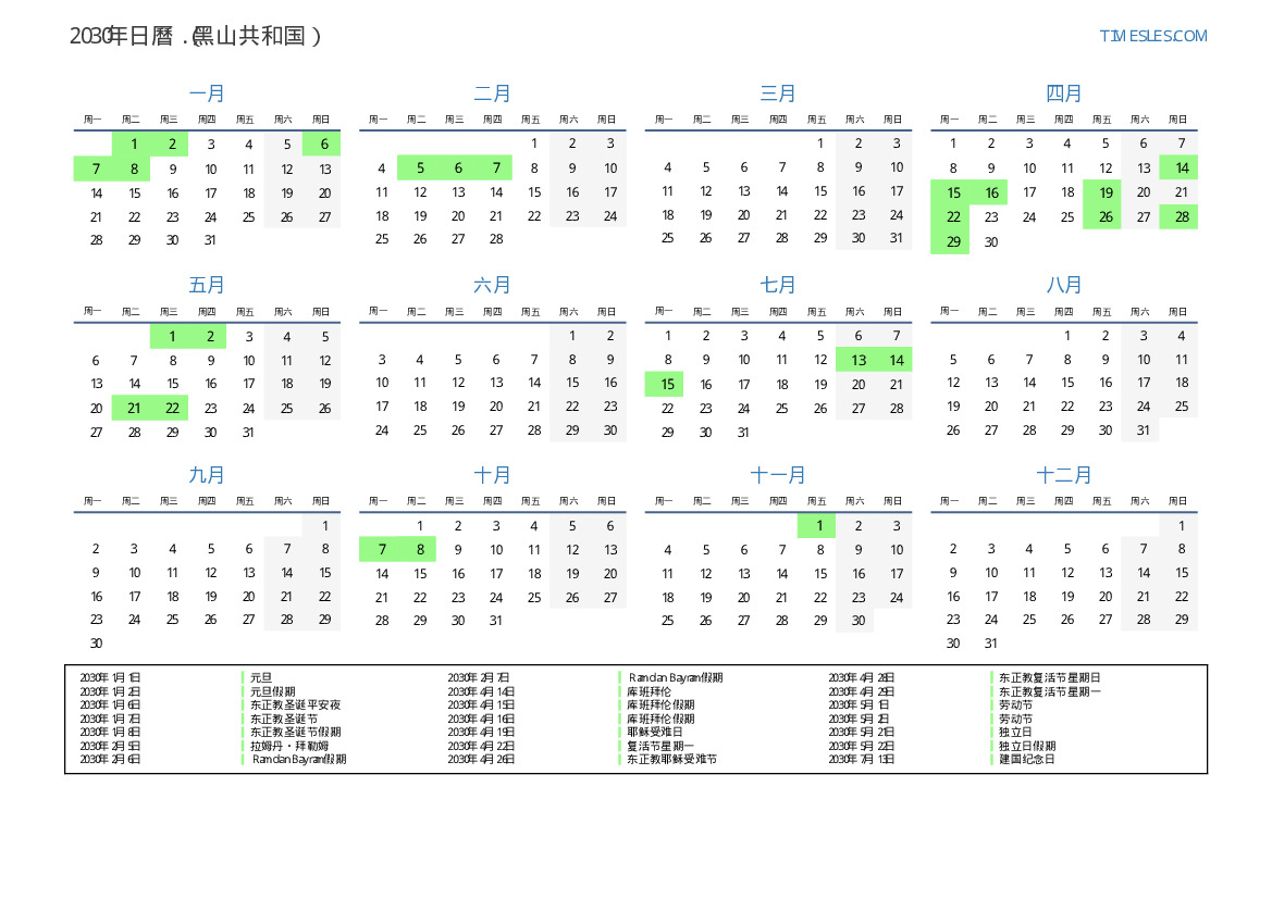 下載並打印2030年黑山共和国節假日和周末的PDF日曆