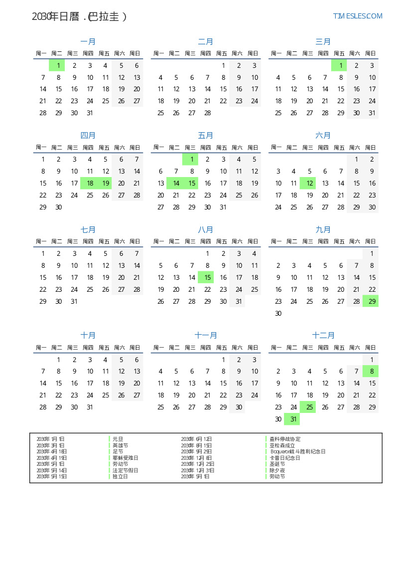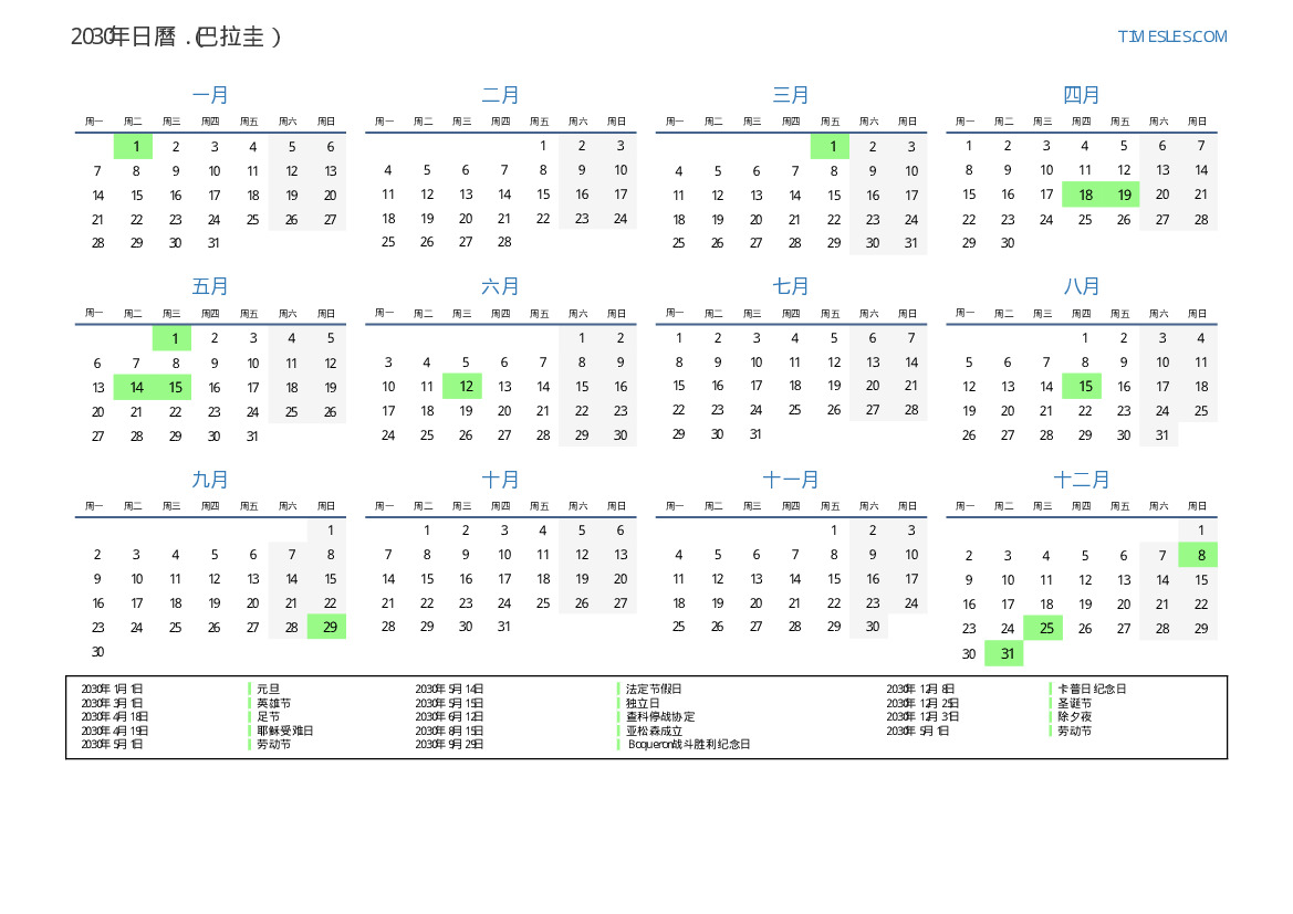 下載並打印2030年巴拉圭節假日和周末的PDF日曆