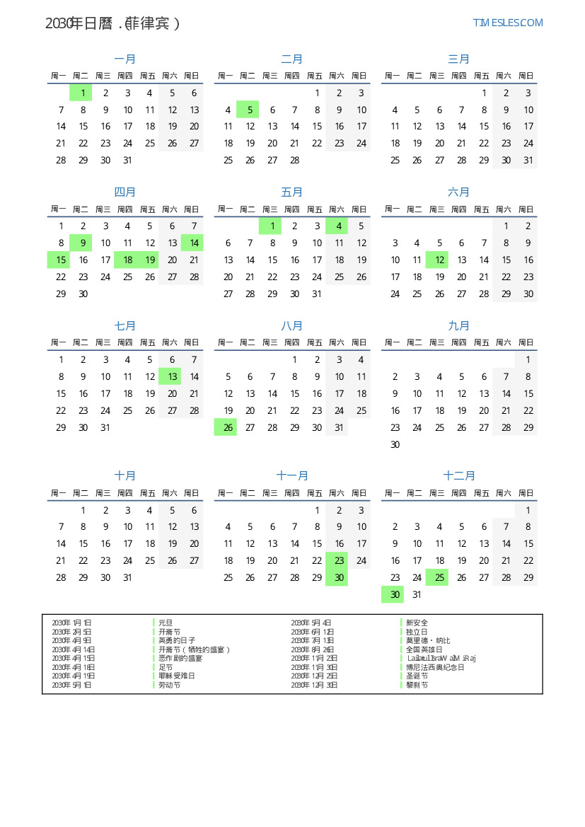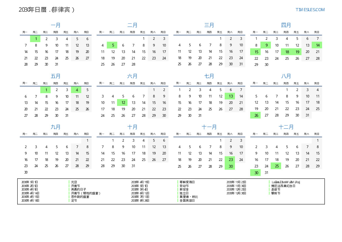 下載並打印2030年菲律宾節假日和周末的PDF日曆