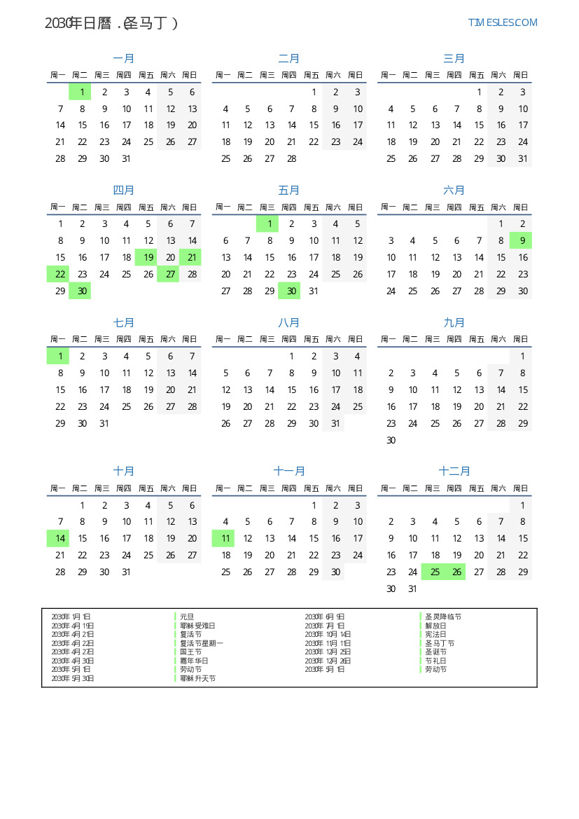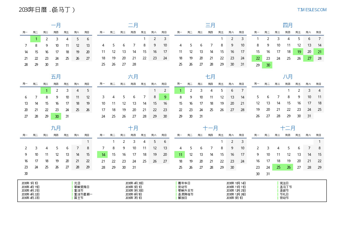 2030年为圣马丁日曆