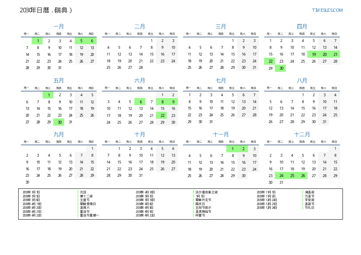 2030年瑞典日曆