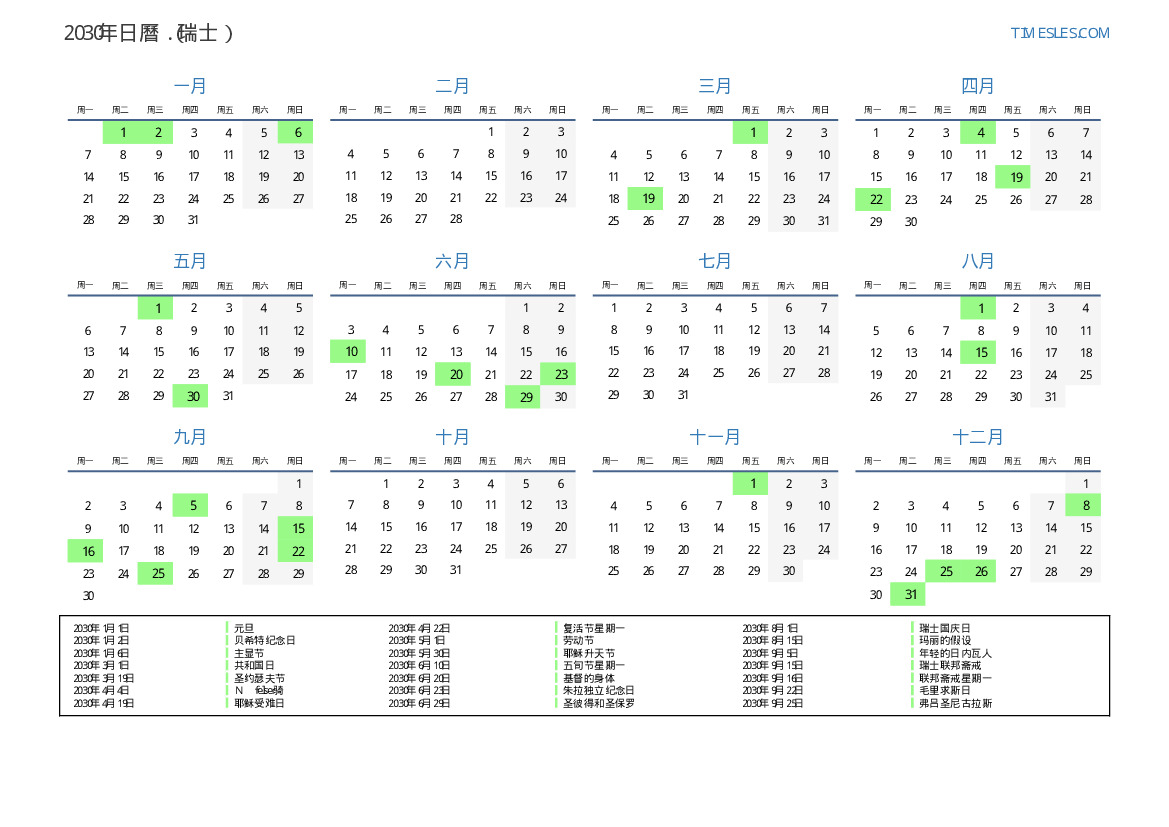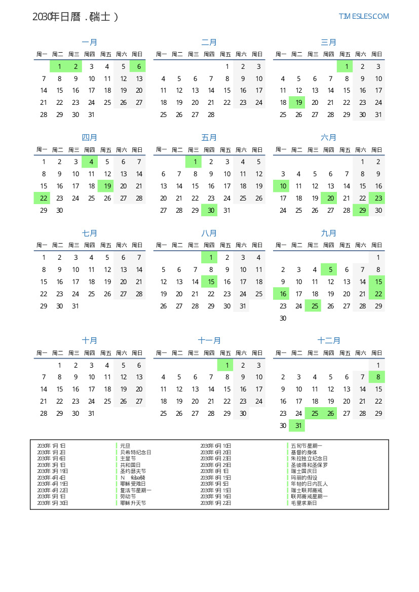 下載並打印2030年瑞士節假日和周末的PDF日曆