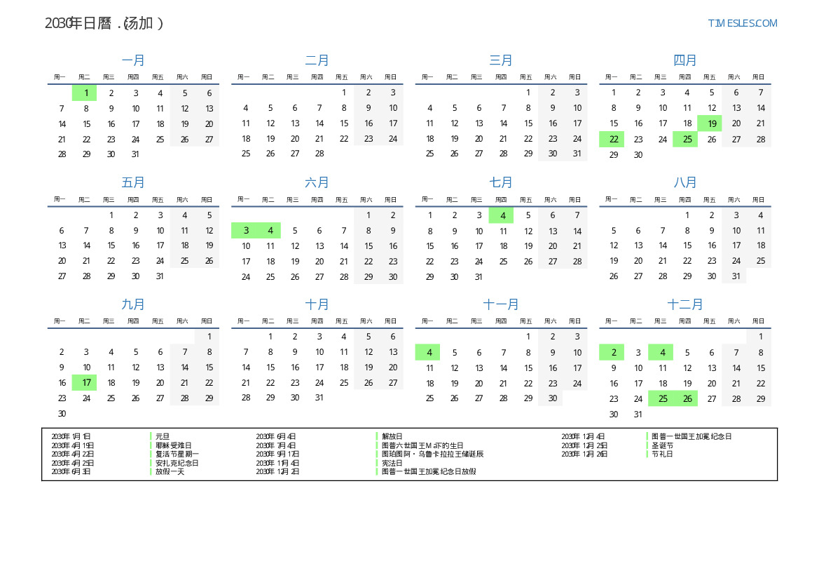 下載並打印2030年汤加節假日和周末的PDF日曆