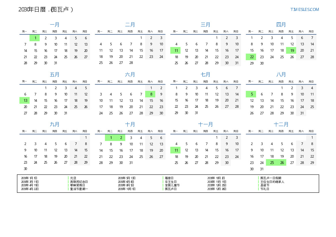 下載並打印2030年对于图瓦卢節假日和周末的PDF日曆