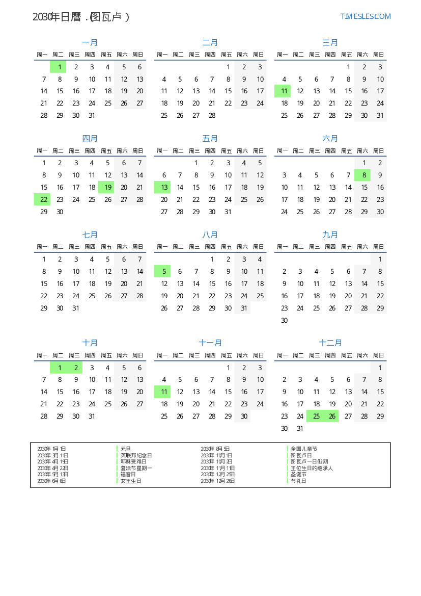 盧薩对于图瓦卢的2030年假期和周末日曆